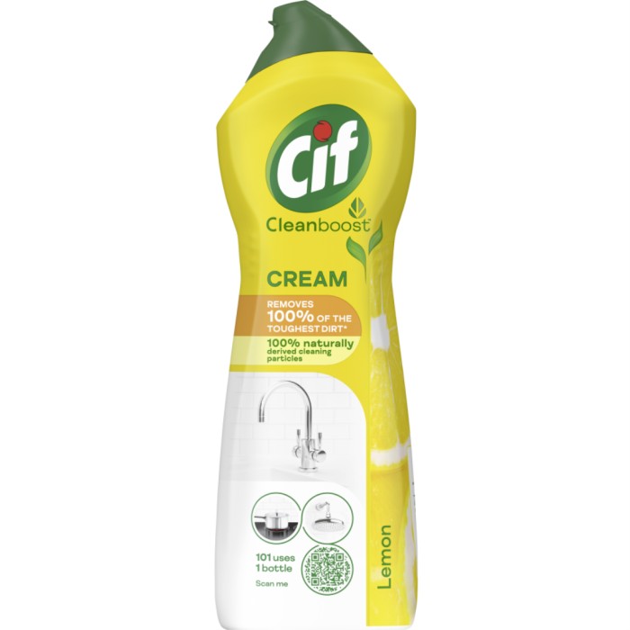 Cif Cream Citron är en kraftfull men skonsam rengöringskräm som enkelt avlägsnar smuts, fett och kalk från kök, badrum och andra ytor. Den lämnar ytorna skinande rena – med en fräsch citrusdoft.