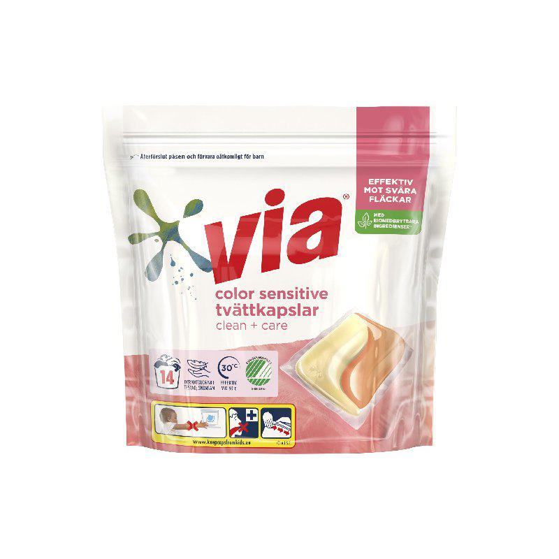 Ge dina färgade kläder en skonsam men kraftfull rengöring med VIA Tvättkapslar Color Sensitive 14-pack.